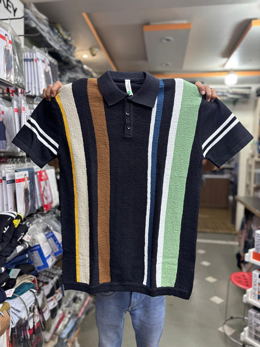 Textured Stripe Terry Polo Shirt | Retro Multi-Color Knit Polo