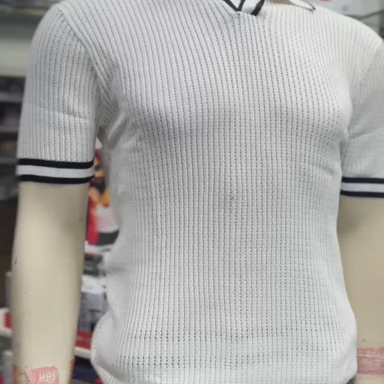 This V-neck ribbed polo is a must-have for anyone looking to add a touch of unique style to their wardrobe.