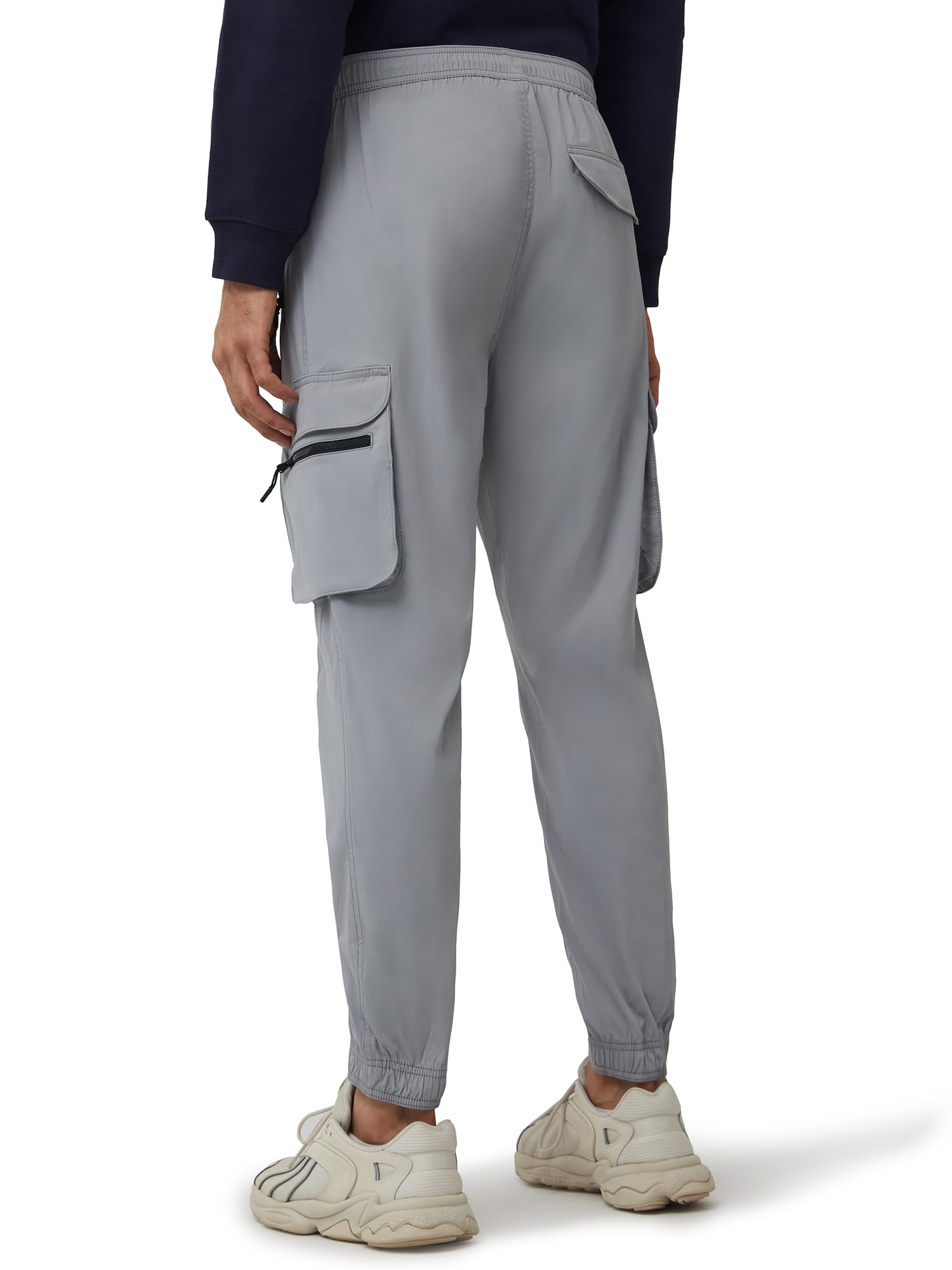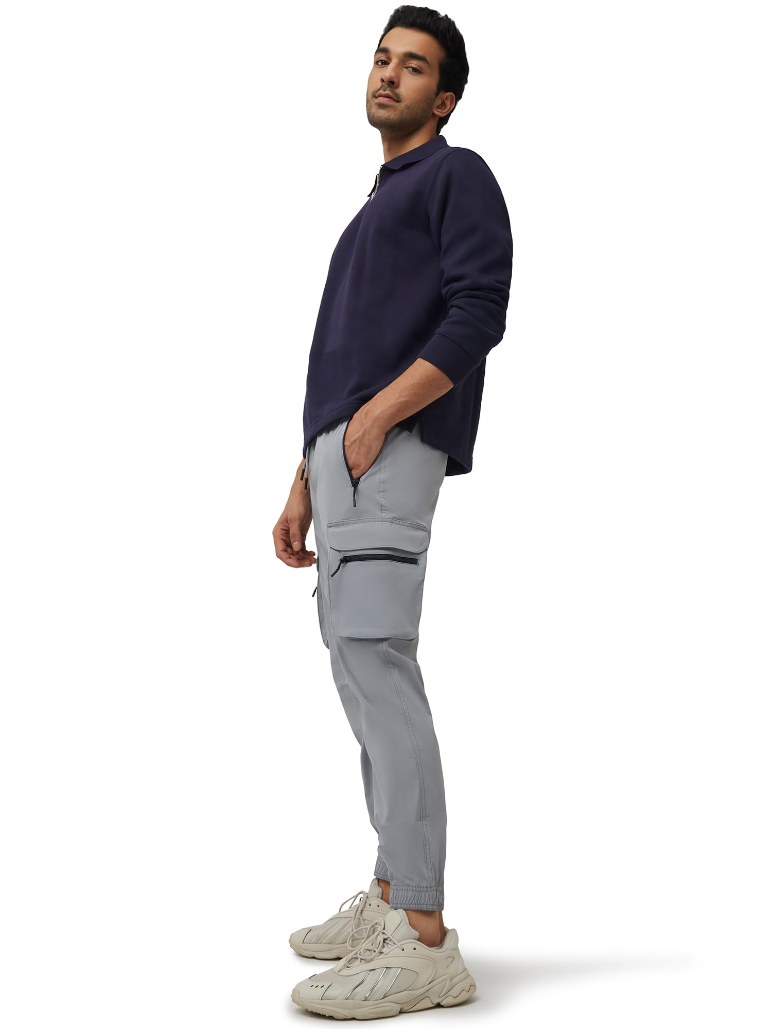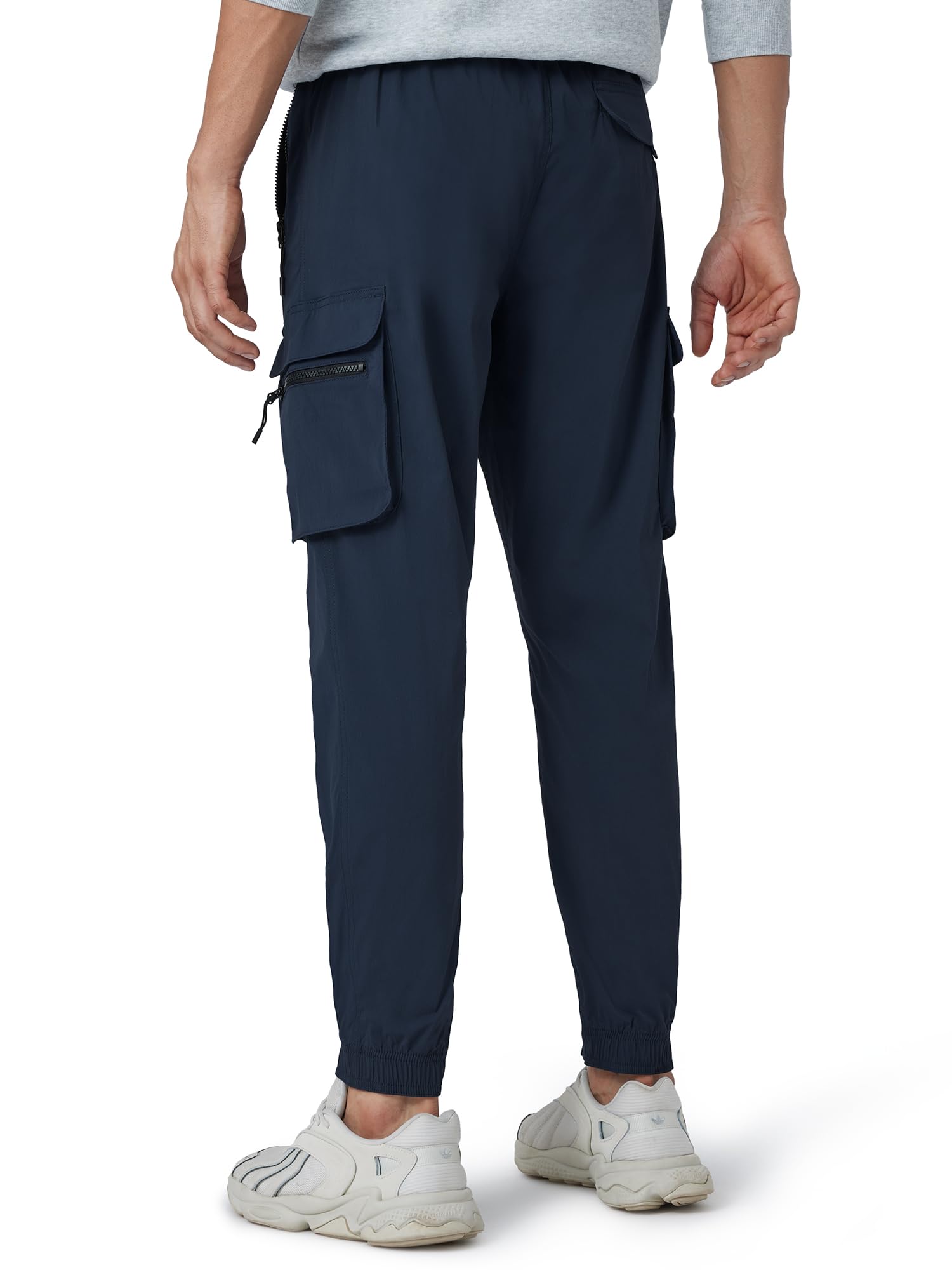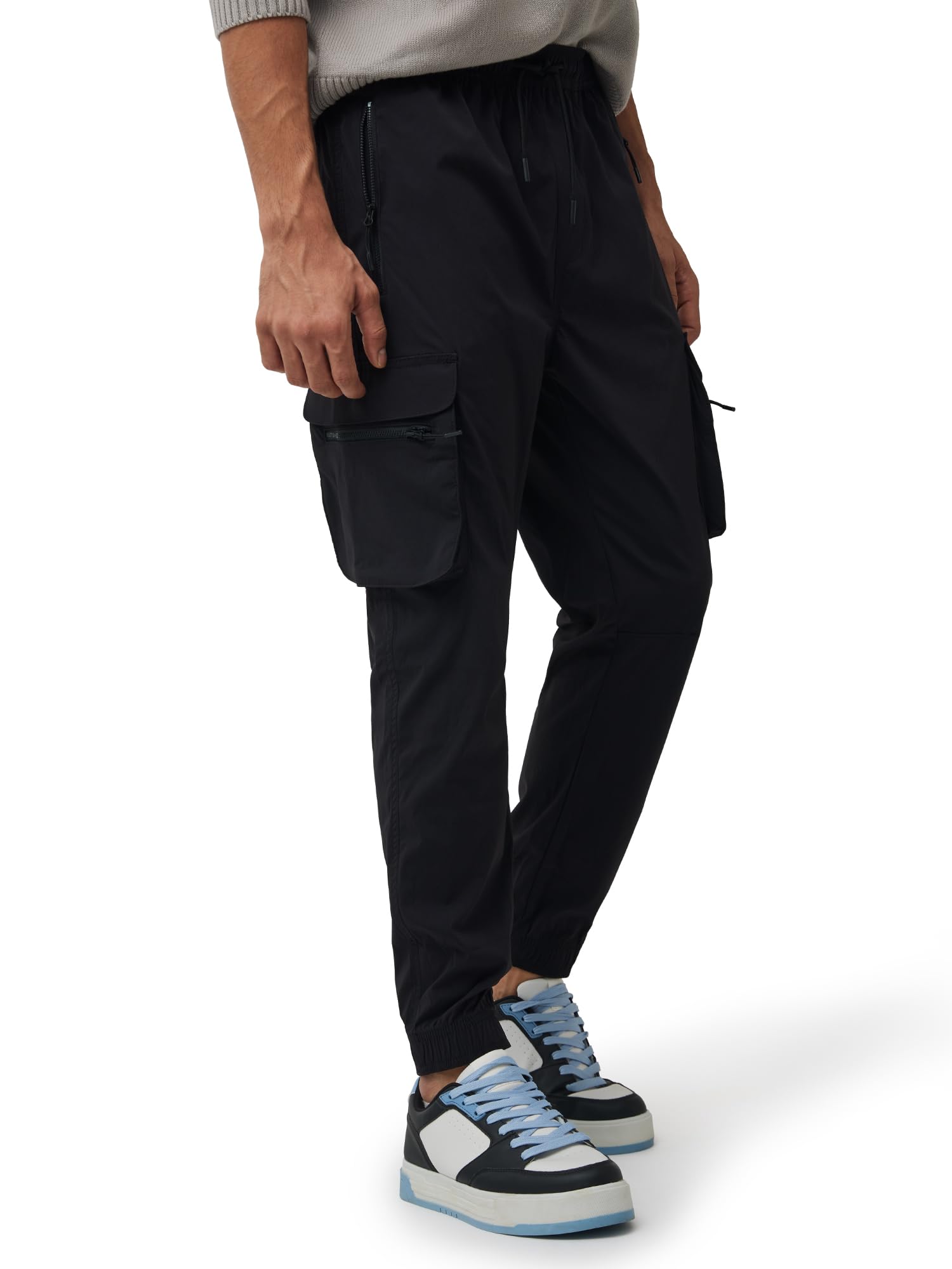 A modish integration of style and functionality, Moveo is made for the adventurists of today, who like to explore every aspect of life. Made from a durable and resilient nylon fabric, its molecular structure offers superior stretch for unrestricted movement. It's quick-drying nature and resistance to wrinkles make it an ideal choice for everyday wear. With a unique play on texture, its ability to maintain shape and colour over time ensures enduring style, making it a staple in the modern wardrobe. The Moveo cargo joggers come designed with an adjustable drawcord at the elasticated waist for a custom fit. With a skinny fit perfect for everyday wear, these joggers feature multiple pockets like front zipper pockets with pullers, flap leg pockets and back pockets with press button closure and a zipper outer compartment for added storage. Whether you're catching up with friends over coffee, trekking through the urban jungle or hiking the untamed trails, these cargo joggers are perfect for it all.