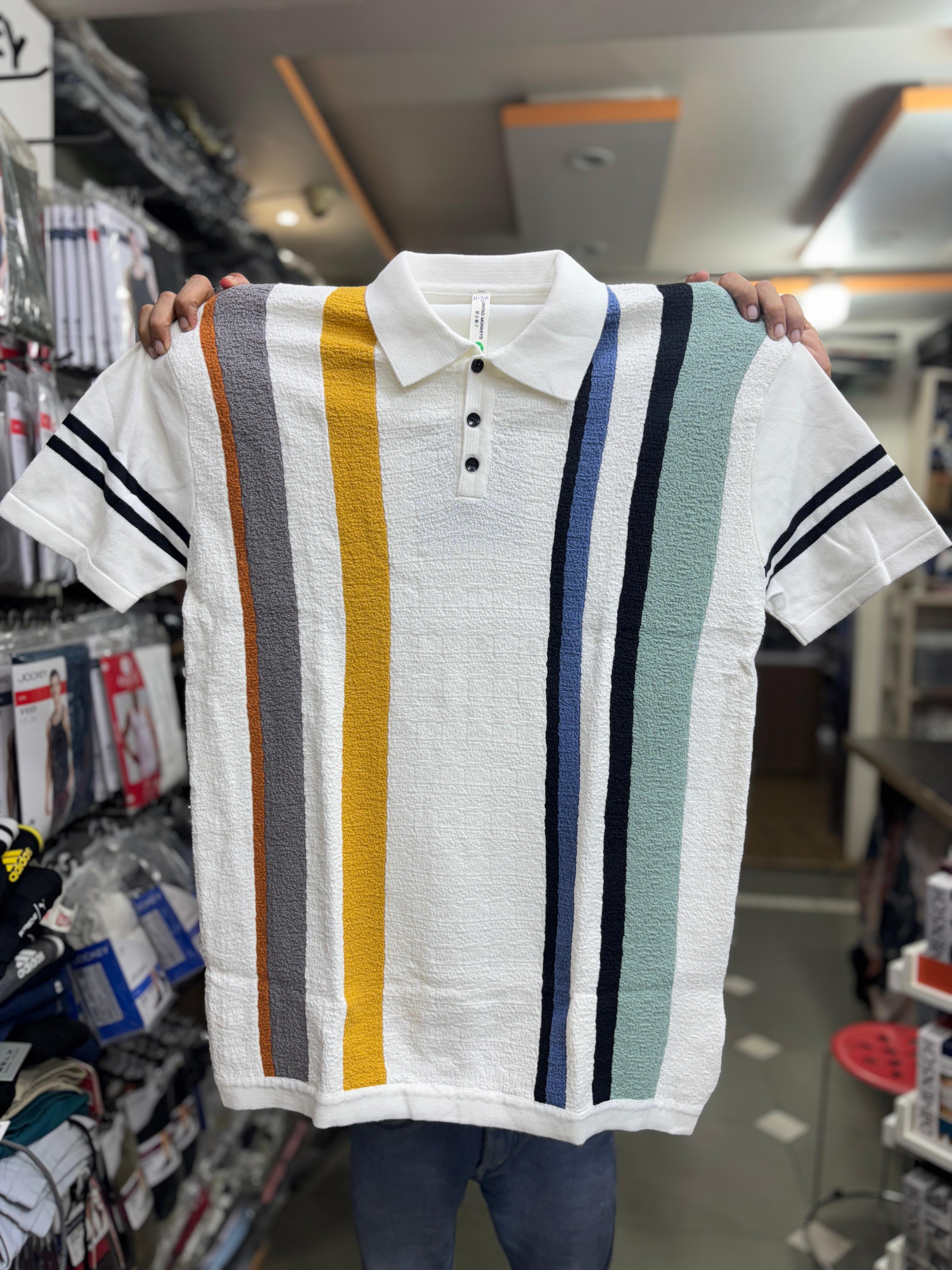 Textured Stripe Terry Polo Shirt | Retro Multi-Color Knit Polo